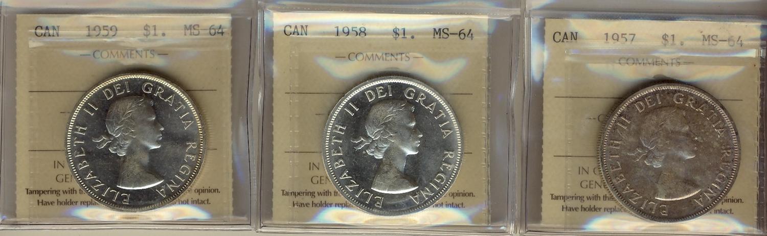 1957, 1958 & 1959 $1 ICCS MS64. Lot of 3 coins.