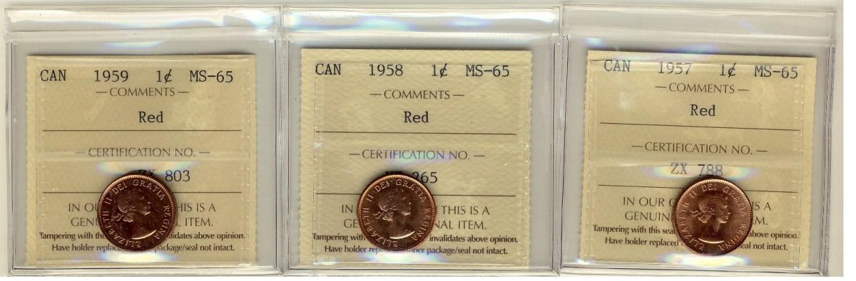 1957, 1958, 1959, 1¢ ICCS MS65 Red. Lot of 3 coins,