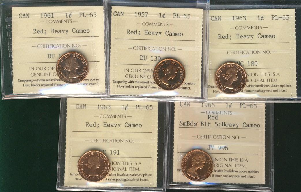 1957, 1961, 1963(2) & 1965 SmBds Blt 1¢ ICCS PL65 Heavy Cameo. Lot of 5 coins.