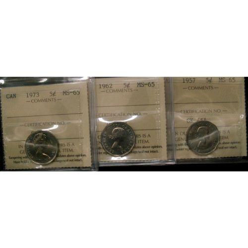 1957, 1962, 1973 5¢ all three coins ICCS MS-6