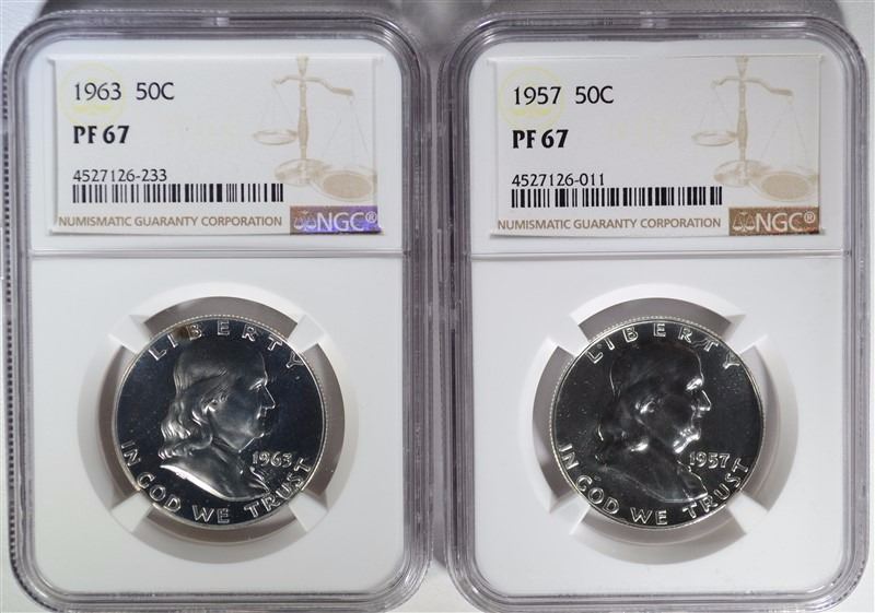 1957 & 1963 FRANKLIN HALVES, NGC PF-67 ESTIMATE $125 - $150.