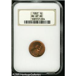 <B>1957 1C MS67 Red NGC.</B></I> An interesting coin with variegated full red and lilac coloration on each side. Very seldom found in such a superior state. Population: 8 in 67, 0 finer (1/05).<BR><I>From The Kim Mitchell Collection, Part Two.</B></I> Lot:5573