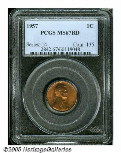<B>1957<1C> MS67 Red PCGS.</B></I> Vivid fire-red color blazes from both sides of this sharply struck, highly lustrous Superb Gem. Only the smallest of marks and a minimal number of flyspecks are seen on either side, using magnification. A lovely, conditionally scarce Lincoln cent, and none have been graded any finer, by PCGS. Population: 3 in 67 Red, 0 finer (6/05).<BR><I>From The William Bickel Collection, Part One.</B></I>