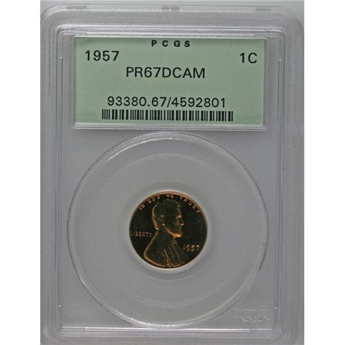 <B>1957<1C> PR67 Deep Cameo PCGS.</B></I> A fire-red Superb Gem with occasional and subtle plum tints. Gorgeously preserved, and rare in such quality. Most proof 1957 cents have developed carbon over the past half century, but not the present piece. Encapsulated in a green label holder. Population: 7 in 67 Deep Cameo, 1 finer (8/06).
