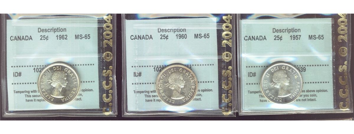 1957 25¢, 1960 & 1962 CCCS MS65. Lot of 3 coins.