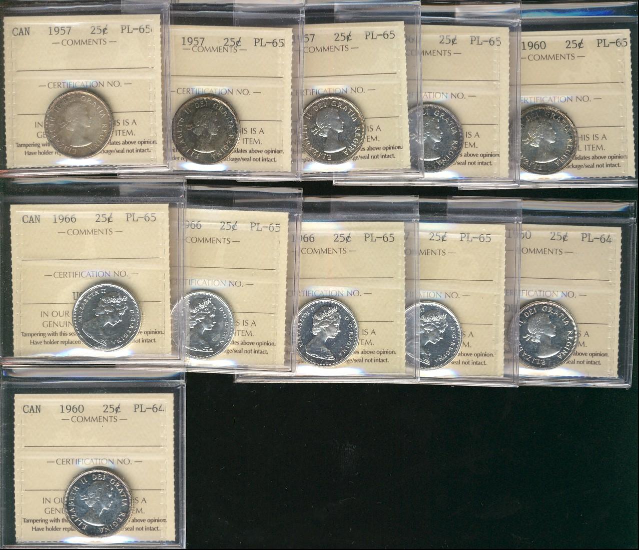 1957 25¢(3), 1960(2), 1966(3) & 1967 ICCS PL65 along with 1960 PL64(2). Lot of 11 coins.