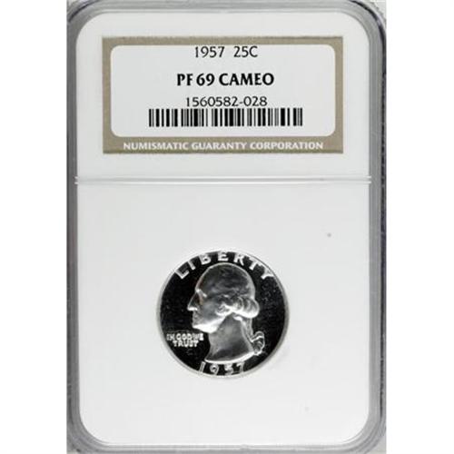 <B>1957 25C PR69 Cameo NGC.</B></I> NGC Census: (50/0). PCGS Population (4/0). (#85989)<BR><BR><b>Shipping:</b> Coins & Currency (<a target="_blank" href="http://www.heritageauctions.com/common/shipping.php">view shipping information</a>\)