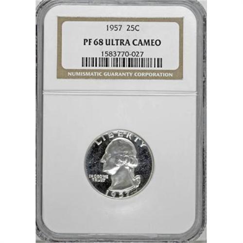 <B>1957 25C PR68 Deep Cameo NGC.</B></I> NGC Census: (18/3). PCGS Population (20/5). Numismedia Wsl. Price for NGC/PCGS coin in PR68: $460. (#95989)<BR><BR><b>Shipping:</b> Coins & Currency (<a target="_blank" href="http://www.heritageauctions.com/common/shipping.php">view shipping information</a>)