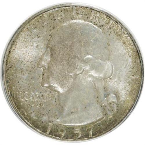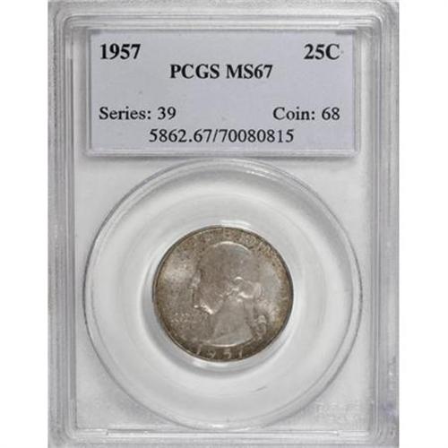 <B>1957 25C MS67 PCGS.</B></I> PCGS Population (173/0). NGC Census: (319/3). Mintage: 46,500,000. Numismedia Wsl. Price for NGC/PCGS coin in MS67: $100. (#5862)<BR><BR><B>Coin Engraver:</B> John Flanagan<BR><BR><b>Shipping:</b> Coins & Currency (<a target="_blank" href="http://www.heritageauctions.com/common/shipping.php">view shipping information</a>)