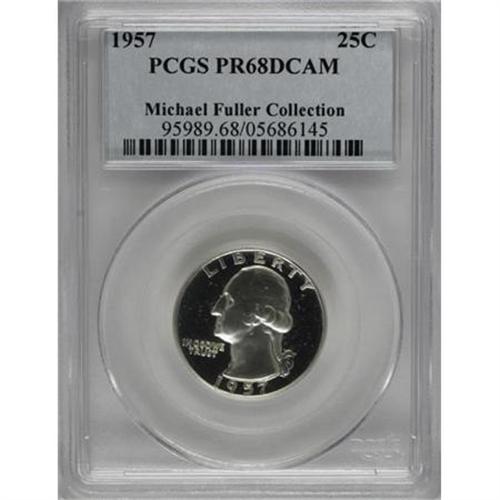 <B>1957 25C PR68 Deep Cameo PCGS.</B></I> Pure white and essentially flawless. The thickly frosted devices contrast starkly with the deeply mirrored fields, yielding a dramatic cameo effect. Population: 20 in 68 Deep Cameo, 5 finer (10/07).<BR> <BR><I>From The Michael Fuller Collection.</B></I><BR><BR><b>Shipping:</b> Coins & Currency (<a target="_blank" href="http://www.heritageauctions.com/common/shipping.php">view shipping information</a>)