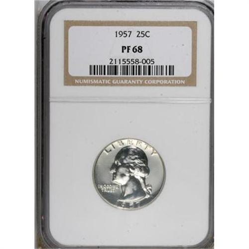 <B>1957 25C PR68 NGC.</B></I> NGC Census: (273/96). PCGS Population (179/36). Mintage: 1,247,952. Numismedia Wsl. Price for NGC/PCGS coin in PR68: $33. (#5989)<BR><BR><B>Coin Engraver:</B> John Flanagan<BR><BR><b>Shipping:</b> Coins & Currency (<a target="_blank" href="http://www.heritageauctions.com/common/shipping.php">view shipping information</a>)