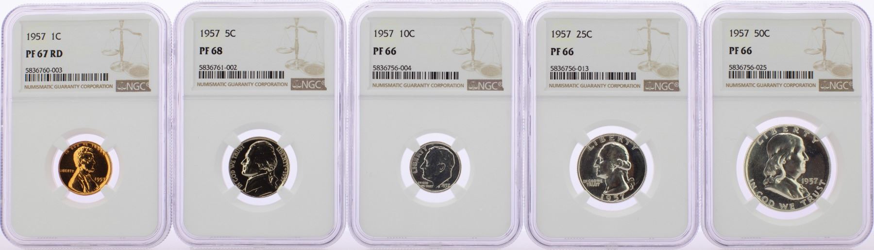One 1957 (5) Coin Proof Set NGC Graded PF66/PF67RD/PF68.