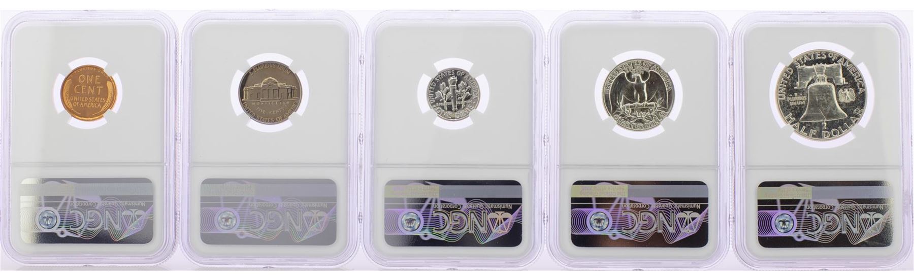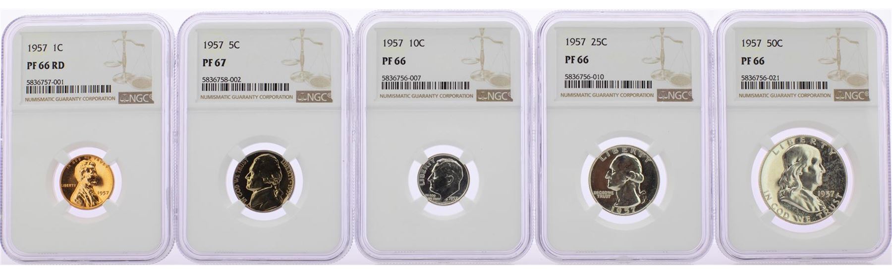 One 1957 (5) Coin Proof Set NGC Graded PF66RD/PF66/PF67. NGC Certified.