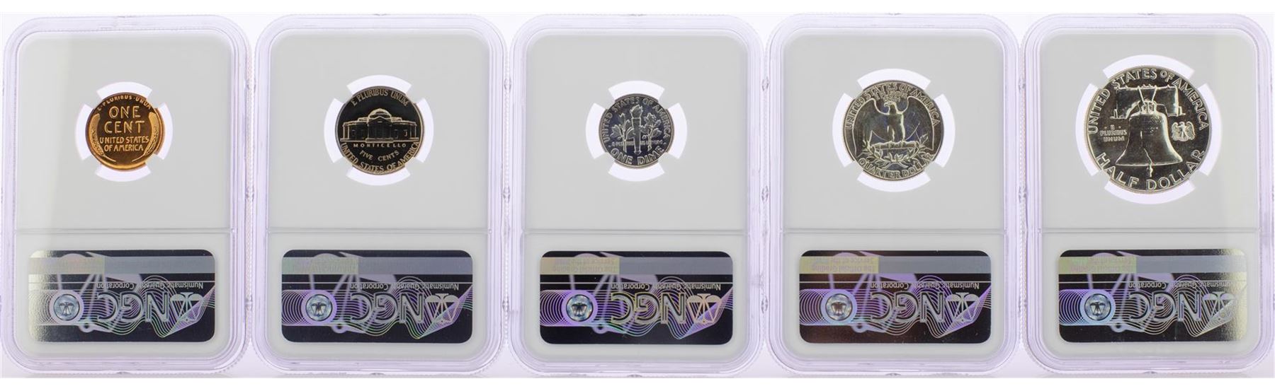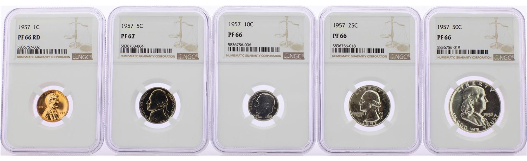 One 1957 (5) Coin Proof Set NGC Graded PF66RD/PF66/PF67. NGC Certified.