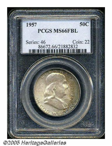<B>1957<50C> MS66 Full Bell Lines PCGS.</B></I> Superb-Gem with heavy grape and lime reverse toning. A number of light wispy singular marks are noted, but as befits the grade, none are notable.<BR><I>From The Southern Collection.</B></I>