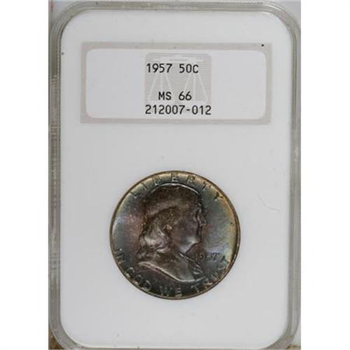 <B>1957 50C MS66 NGC.</B></I> NGC Census: (381/21). PCGS Population (684/12). Mintage: 5,100,000. Numismedia Wsl. Price for NGC/PCGS coin in MS66: $60. (#6672)<BR><BR><B>Coin Engraver:</B> John R. Sinnock<BR><BR><b>Shipping:</b> Coins & Currency (<a target="_blank" href="http://www.heritageauctions.com/common/shipping.php">view shipping information</a>)