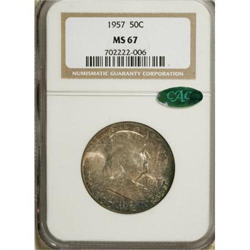 <B>1957 50C MS67 NGC, CAC.</B></I> NGC Census: (20/1). PCGS Population (11/1). Mintage: 5,100,000. Numismedia Wsl. Price for NGC/PCGS coin in MS67: $580. (#6672)<BR><BR><B>Coin Engraver:</B> John R. Sinnock<BR><BR><b>Shipping:</b> Coins & Currency (<a target="_blank" href="http://www.heritageauctions.com/common/shipping.php">view shipping information</a>)