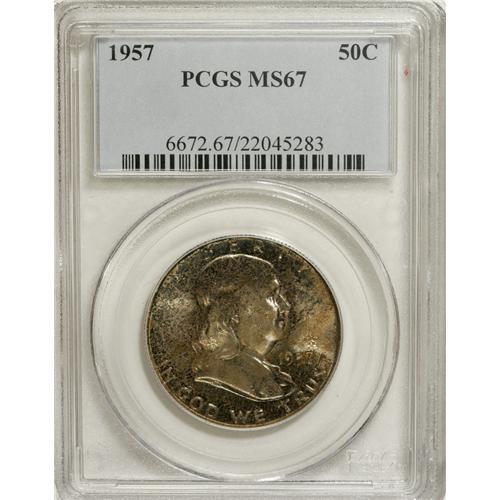 1957 50C MS67 PCGS. A rich layer of deep, multicolored