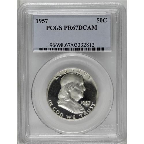 <B>1957<50C> PR67 Deep Cameo PCGS.</B></I> The thickly frosted devices rise powerfully above the near-bottomless fields with full striking definition. A no-questions Superb Gem. Population: 52 in 67 Deep Cameo, 49 finer (3/06). <BR><BR><B>Important notice:</B> Heritage usually auctions material at the rate of 200-250 lots per hour. On some occasions eBay Live bid software or the Internet may not be able to keep up with the pace of the auction. We recommend placing a realistic absentee bid now as insurance to avoid disappointment. Occasionally the auctioneer may eliminate or reject an eBay Live bid, and the auctioneer may also reopen a lot after the close of the eBay live bidding (usually because we missed an audience bid), and may reject your bid even if it shows you as the winning bidder. By bidding via eBay Live, you agree that Heritage may award the lot to another bidder at its sole discretion under the circumstances described above or any other reasonable circumstances. Since eBay bids are not shown to us until we open the lot on the floor, we treat those bids just like floor bids. In most cases the floor responds before the eBay bid is presented to us, due to Internet lag time, so for consistency we have made it a policy that floor bids are always considered first over tie eBay live bids. Also please note that all Heritage lots purchased through eBay Live carry a 20% Buyer's Premium. Please make sure you read the Terms and Conditions before you bid. This lot is being auctioned in conjunction with a live floor auction by Heritage Galleries & Auctioneers. All final auction and invoice information will be supplied by Heritage Galleries & Auctioneers, and all other information should be considered preliminary. Lot:3155 <BR><BR><B>Winning Notification and Billing:</B> After the FINAL session in this auction is complete, Heritage will send e-mail and snail mail invoices. This process normally takes several days. All final auction and invoice information will be supplied by Heritage Galleries & Auctioneers, and all other information should be considered preliminary. <BR><BR>This auction will be conducted on a live auction floor and over the Internet through eBay Live. If you choose to place an absentee bid, please take a moment to <font color='#0000ff'><u><a href='http://pages.ebay.com/liveauctions/help/before/laabsentee.html'>learn how eBay Live absentee bidding works</a></u></font><font color='#000000'>