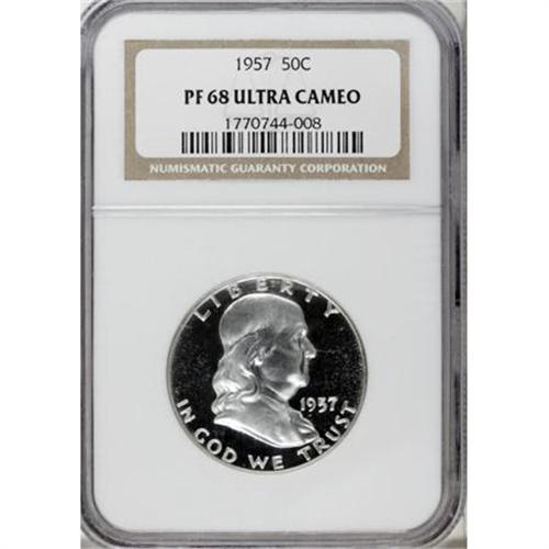 <B>1957 50C PR68 Ultra Cameo NGC.</B></I> Deeply frosted motifs contrast with jet-black mirrors. This Superb Gem shows none of the field hairlines that so often plague this issue. NGC has certified a mere two pieces finer (1/08).<BR><BR><b>Shipping:</b> Coins & Currency (<a target="_blank" href="http://www.heritageauctions.com/common/shipping.php">view shipping information</a>)