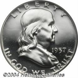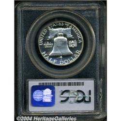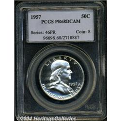 <B>1957<50C> PR68 Deep Cameo PCGS.</B></I> The flashy mirrored fields are impressive, as they provide deep background contrast for marvelous frosted devices. A gorgeous Superb Gem. Population: 48 in 68, 2 finer (3/04).<BR><I>Ex: Atlanta ANA Signature Sale (Heritage, 8/01), lot 6363, which realized $3,738.</B></I><BR><I>From the JFS Collection.</B></I> <BR><BR><B>Important notice:</B> Heritage usually auctions material at the rate of 200-250 lots per hour. On some occasions eBay Live bid software or the Internet may not be able to keep up with the pace of the auction. We recommend placing a realistic absentee bid now as insurance to avoid disappointment. Occasionally the auctioneer may eliminate or reject an eBay Live bid, and the auctioneer may also reopen a lot after the close of the eBay live bidding (usually because we missed an audience bid), and may reject your bid even if it shows you as the winning bidder. By bidding via eBay Live, you agree that Heritage may award the lot to another bidder at its sole discretion under the circumstances described above or any other reasonable circumstances. Since eBay bids are not shown to us until we open the lot on the floor, we treat those bids just like floor bids. In most cases the floor responds before the eBay bid is presented to us, due to Internet lag time, so for consistency we have made it a policy that floor bids are always considered first over tie eBay live bids. Also please note that all Heritage lots purchased through eBay Live carry a 20% Buyer's Premium. Please make sure you read the Terms and Conditions before you bid. </span></font></tr></table></td></tr></table>