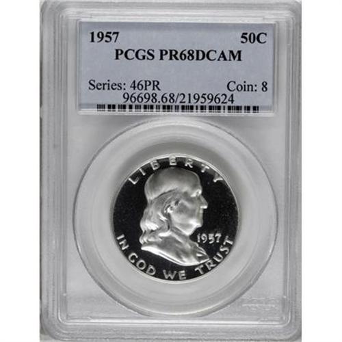 <B>1957 50C PR68 Deep Cameo PCGS.</B></I> This is a conditionally scarce specimen that exhibits dramatically deep reflectivity in the fields, and intensely frosted ice-white devices. A great Superb Gem proof Franklin half. Population: 48 in 68 Deep Cameo, 2 finer (11/07). <BR><I>From The Kallenberg #1 PCGS Registry Set Of Proof Half Dollars.</B></I><BR><BR><b>Shipping:</b> Coins & Currency (<a target="_blank" href="http://www.heritageauctions.com/common/shipping.php">view shipping information</a>)