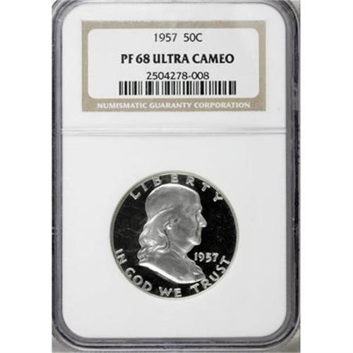 <B>1957 50C PR68 Ultra Cameo NGC.</B></I> Excellent reflectivity and undeniable contrast are the most visible features of this amazing half. Only under magnification does one truly appreciate the specimen's exquisite preservation. Census: 36 in 68 Ultra Cameo, 1 finer (12/07).<BR><BR><b>Shipping:</b> Coins & Currency (<a target="_blank" href="http://www.heritageauctions.com/common/shipping.php">view shipping information</a>)