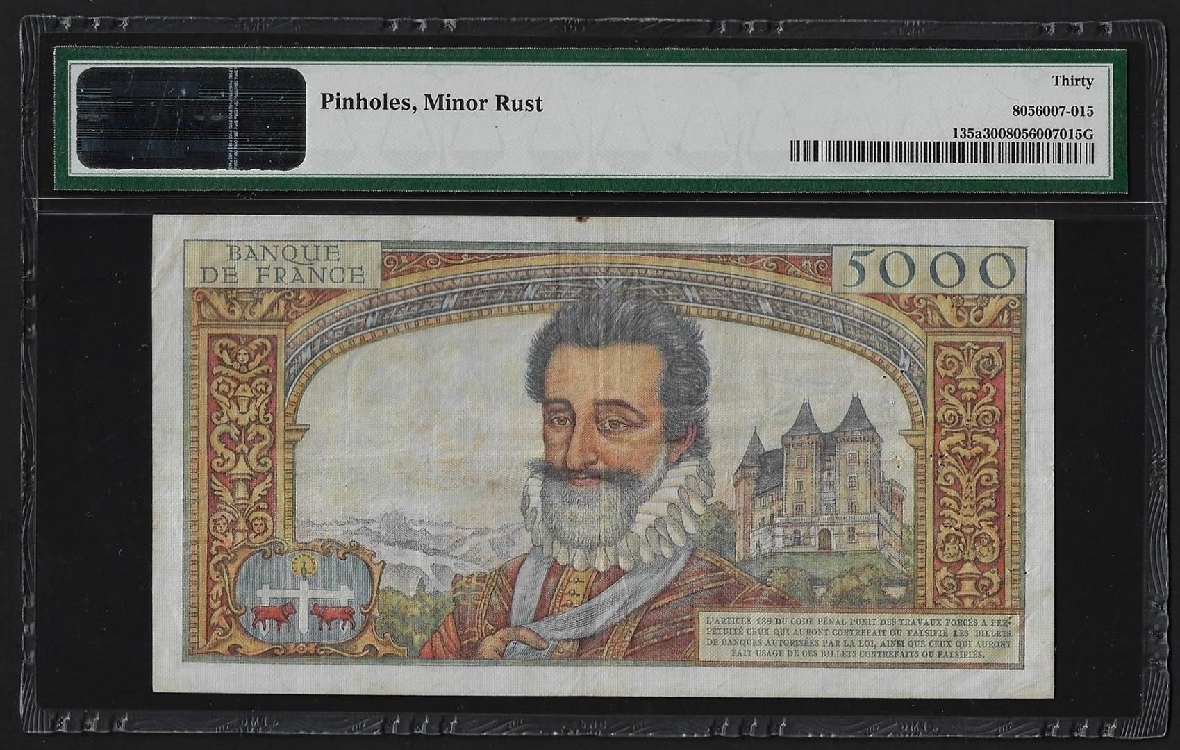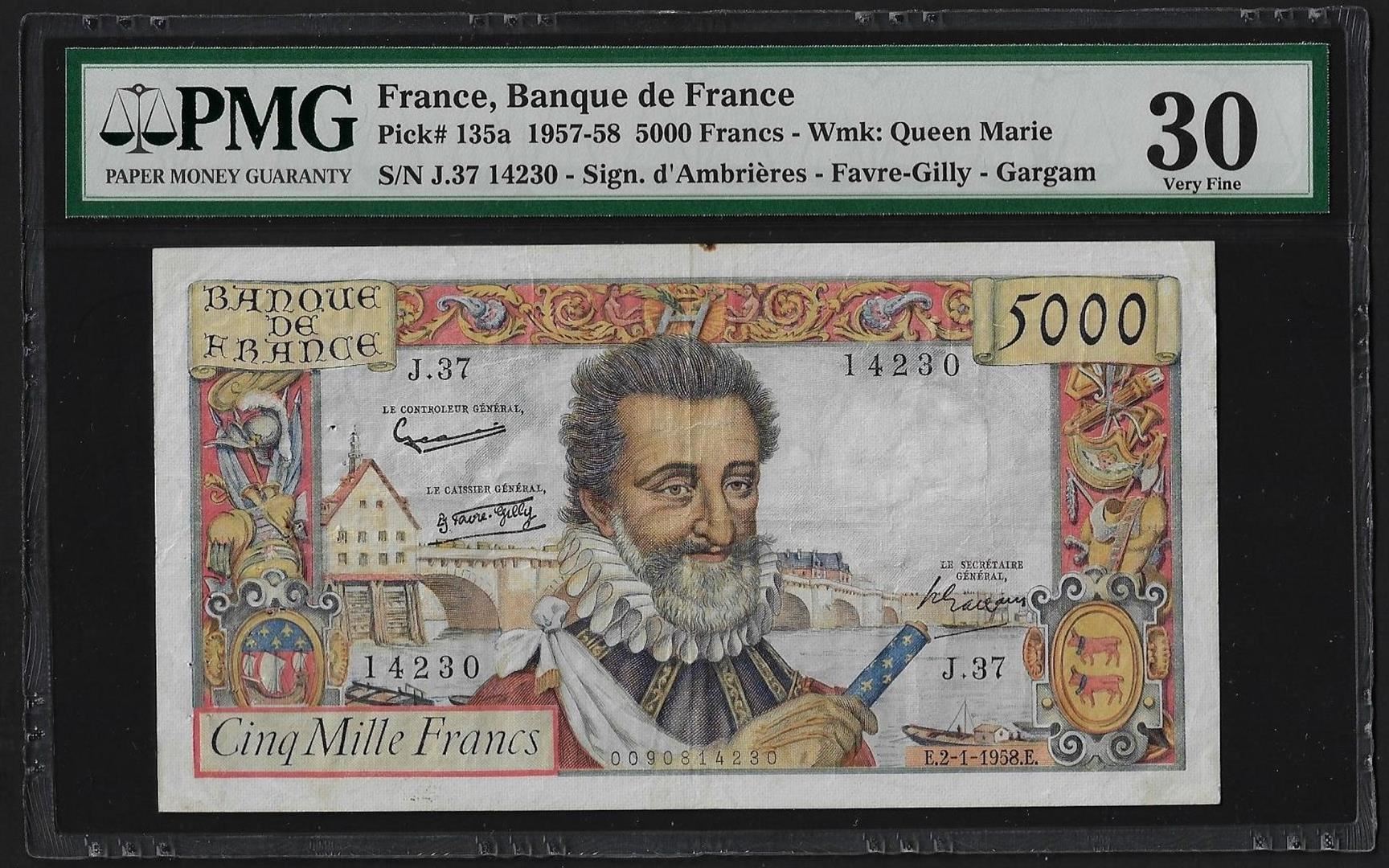 One 1957-58 France 5000 Francs Currency Note Pick#135a PMG Very Fine 30. PMG Certified.