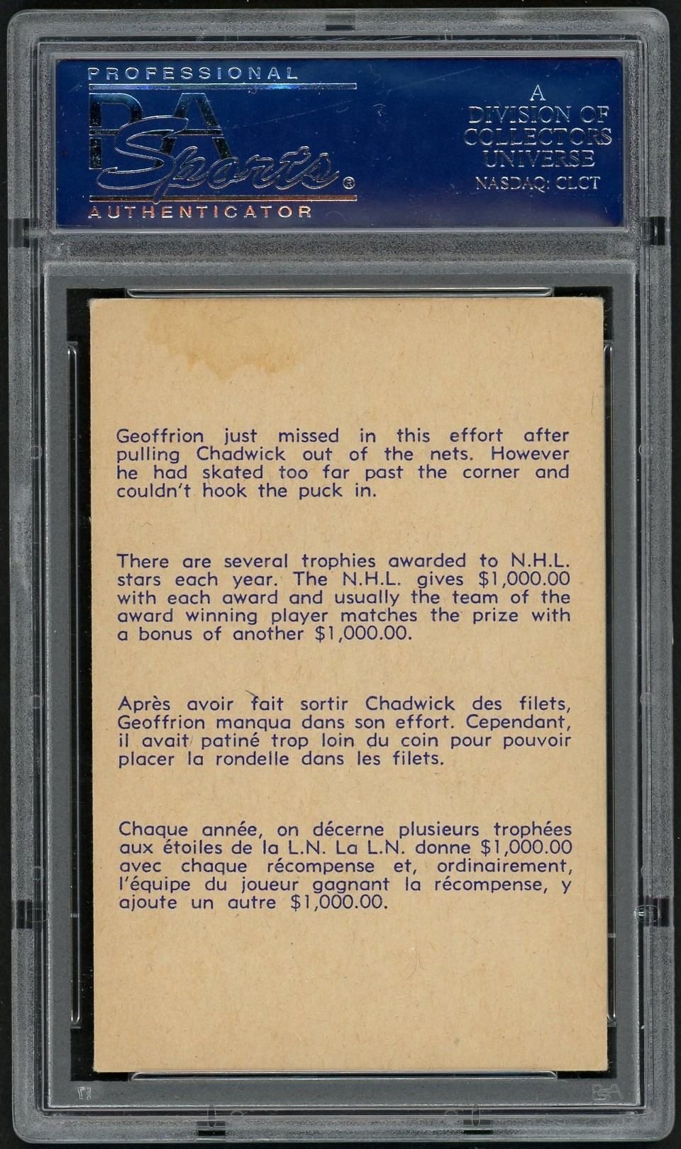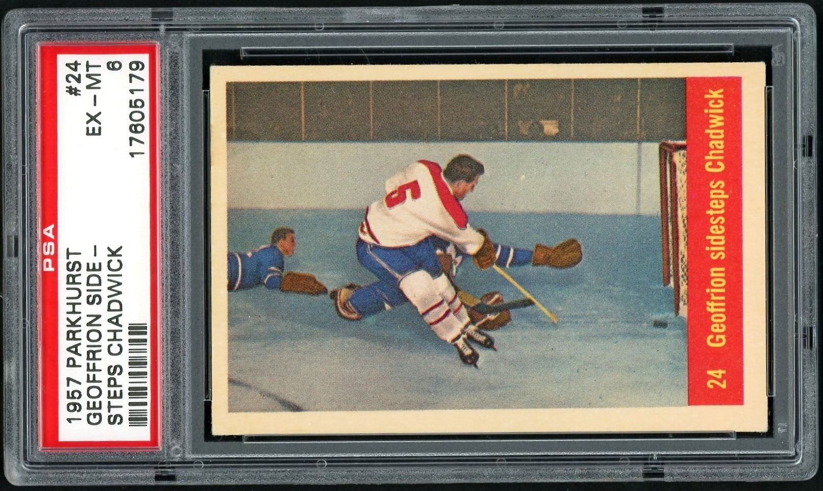 Great action card featuring Ed Chadwick and Canadiens HOFer, Boom Boom Geoffrion. Graded a nice 6 EX-MT by PSA.