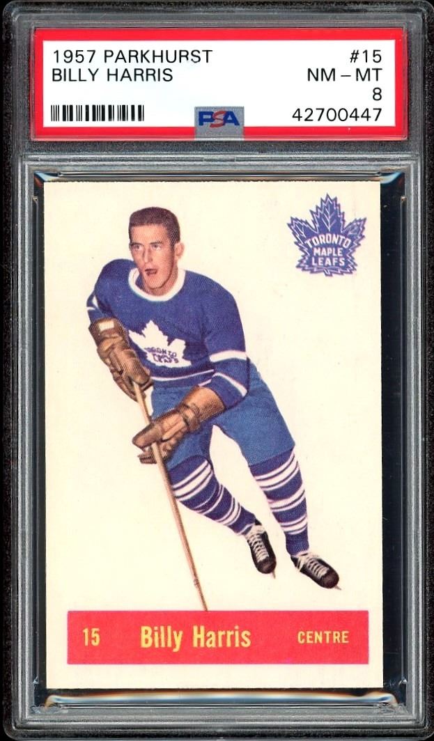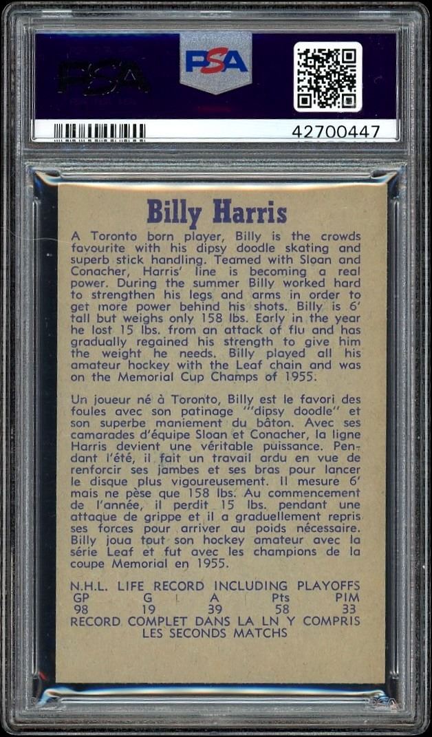 Harris was known as a reliable two-way forward, not a flashy scorer but very consistent and dependable. He was often part of checking lines that helped shut down opposing top scorers, contributing heavily to team success even if not leading in points. He won three Stanley Cups in the early 1960s as a member of the Maple Leafs. Graded a sharp 8 NM-MT by PSA, with only three graded higher.