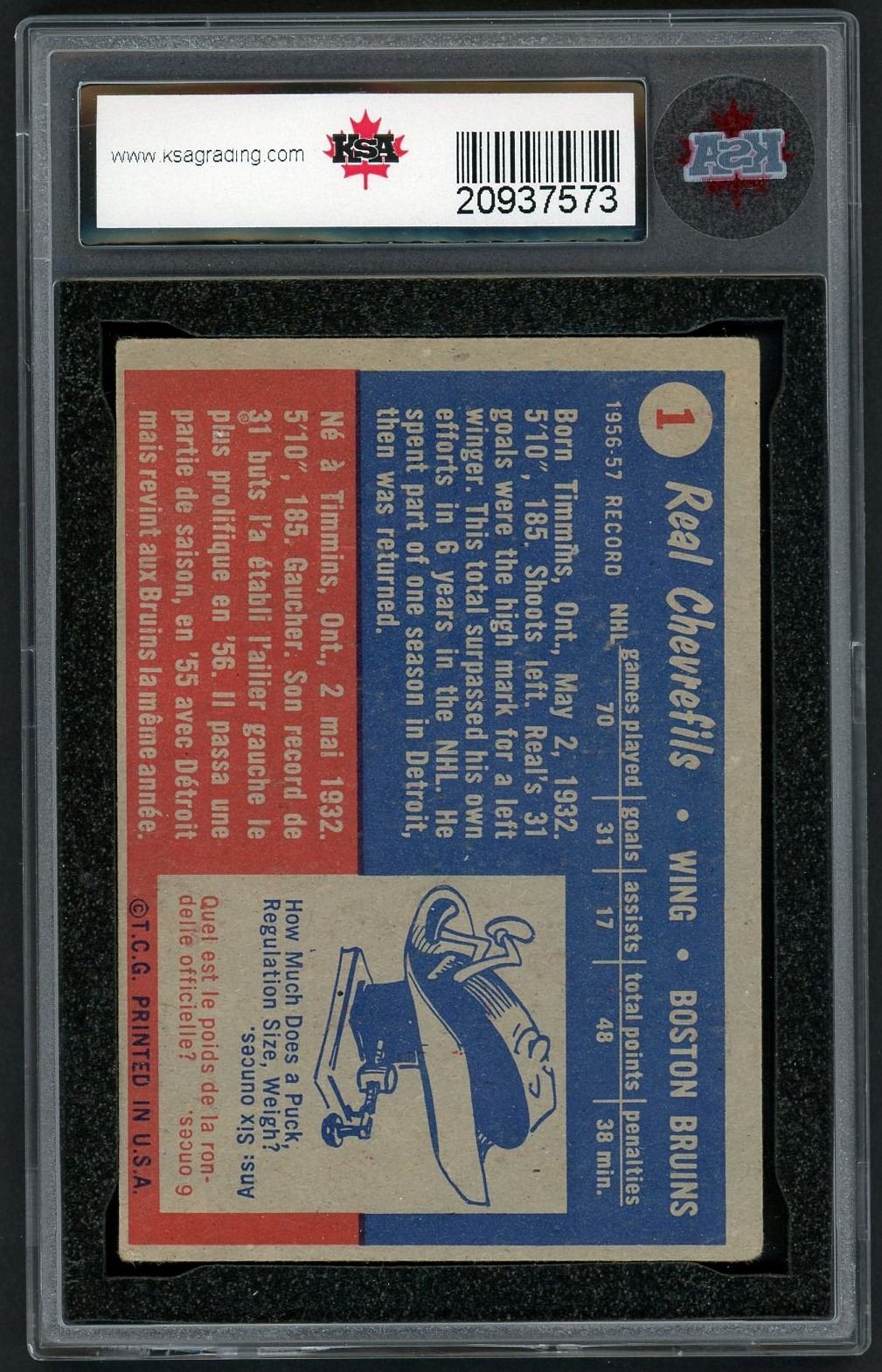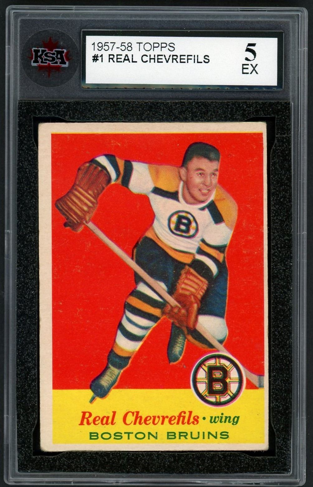 #1 cards in these vintage sets are always "condition sensitive" due the widely used rubber band storage methods. When the entire set was 66 cards or so, it was convenient for collectors to simply rubber band the stack. This one, featuring Bruins winger "Chevy" Chevrefils, graded 5 EX by KSA.
