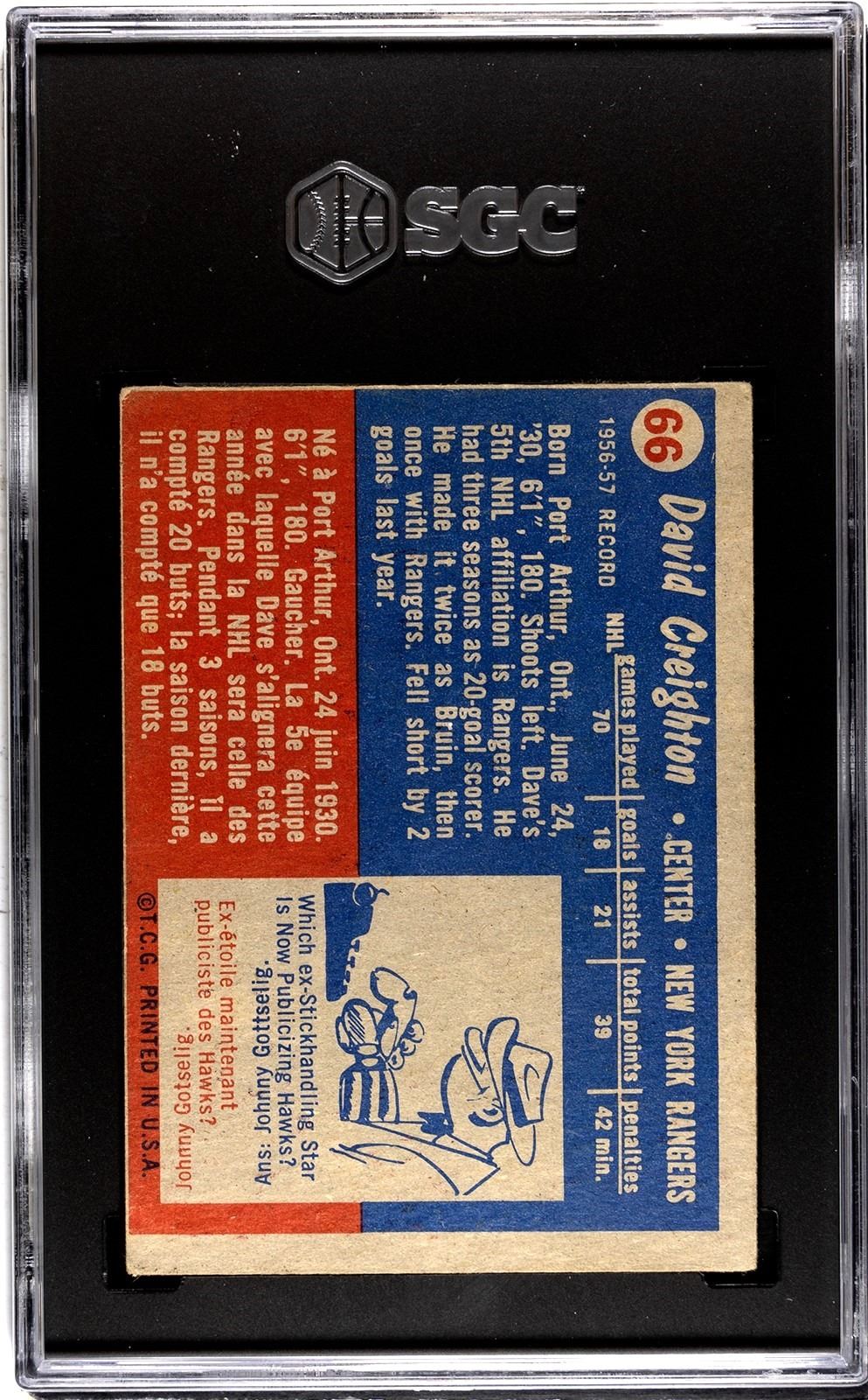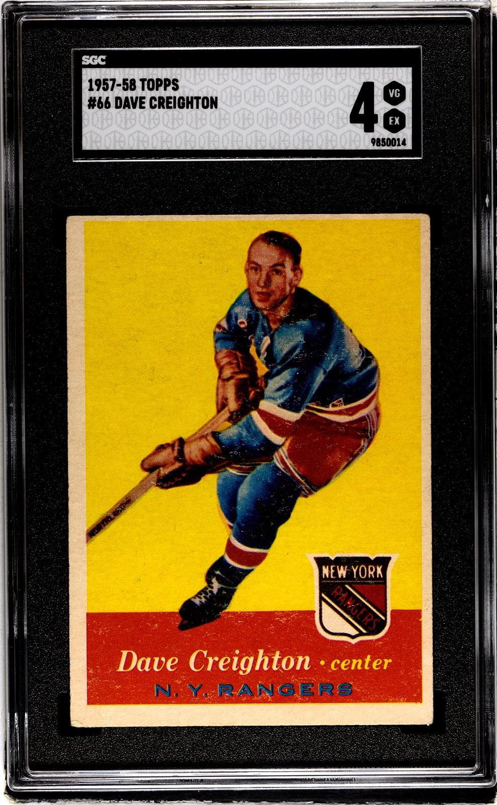 As this is the last card in the set, it is condition sensitive. Rubber bands were a common storage method back then, so a fair amount of surviving first/last cards today bear battle scars. Creighton played pro from 1948 to 1969, which included 616 NHL and 800 AHL games. His son Adam was a 1st round pick who played over 700 NHL games in the 1980s. Graded a nice VG-EX 4 by SGC!
