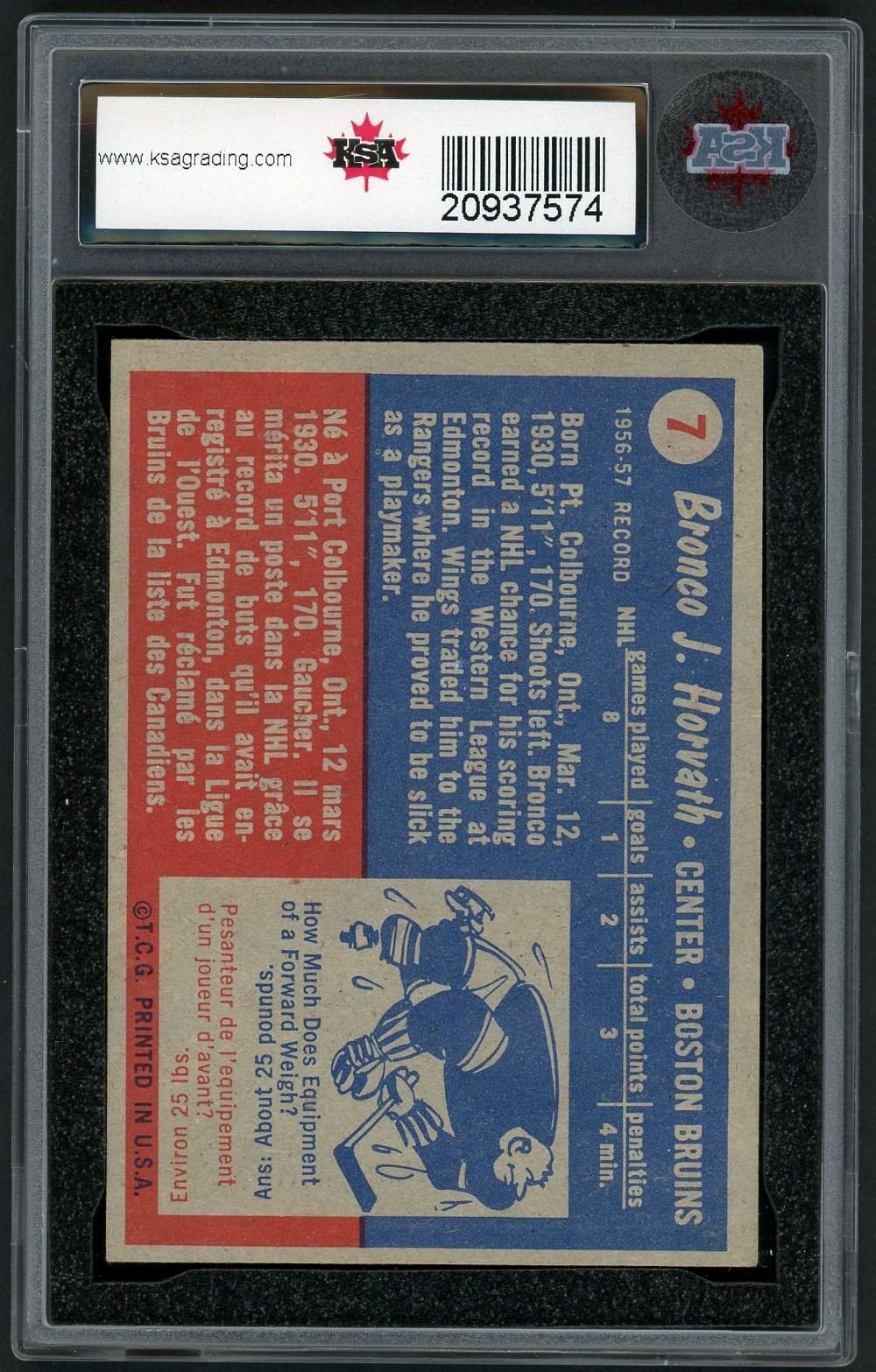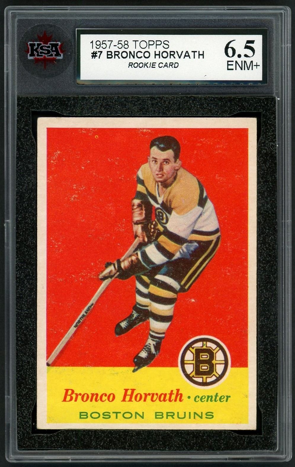 Nice example of Bronc's rookie card. Horvath had a few solid seasons in the NHL (including a 39-goal/80 pt campaign in 1960), but was also a very productive AHLer as well. Graded 6.5 EX-NM+ by KSA.