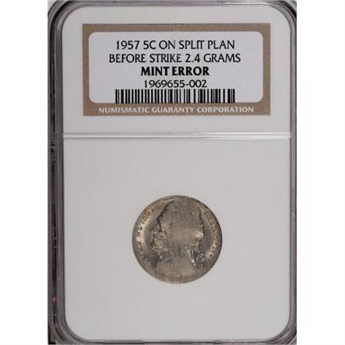 <B>1957 5C Jefferson Nickel--On a Split Planchet Before Strike--Ungraded NGC.</B></I> 2.4 gm. The planchet split in half prior to the strike, perhaps due to improper bonding between the alloy strips. Because the planchet was too thin to fill the dies, the strike was very soft. Lightly toned and satiny with no indication of wear.<BR><BR><B>Coin Engraver:</B> Felix Schlag<BR><BR><b>Shipping:</b> Coins & Currency (<a target="_blank" href="http://www.heritageauctions.com/common/shipping.php">view shipping information</a>)