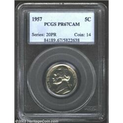 <TR><TD width="100%"><TABLE cellSpacing=1 cellPadding=3 width="100%" border=0><TBODY><TR><TD width="100%" bgColor=#79735c><FONT face=arial color=#ffffff size=3><B>Description</B> </FONT></TD></TR><TR><TD width="100%" bgColor=#ffffff><FONT face=arial size=2><B>1957 5C PR67 Cameo PCGS.</B></I> Brilliant lustrous surfaces with lightly speckled russet adding a hint of color. The devices show a light dusting of frost which creates attractive contrast. </FONT></TD></TR></TBODY></TABLE></TD></TR></TBODY></TABLE><BR><A name=PricesRealized></A><TABLE cellSpacing=0 cellPadding=0 width="100%" bgColor=#000000 border=0><TBODY><TR><TD width="100%"><TABLE cellSpacing=1 cellPadding=3 width="100%" border=0><TBODY><TR><TD width="100%" bgColor=#79735c><A name=PR><FONT face=arial color=#ffffff size=3><B>Previous Prices from Heritage Auctions</B> </FONT></A></TD></TR><TR><TD bgColor=#f6f6ed><TABLE cellSpacing=0 cellPadding=0 width="100%" border=1><TBODY><TR><TD align=middle width="33%"><B>Date</B></TD><TD align=middle width="33%"><B>Service</B></TD><TD align=middle width="33%"><B>Price</B></TD></TR><TR bgColor=whitesmoke><TD width="33%"><B>11/17/2001</B></TD><TD width="33%">NGC</TD><TD width="33%">$110.40</TD></TR></TBODY></TABLE></TD></TR><TR><TD bgColor=#ffffff><FONT face=arial size=1 ?>PLEASE NOTE: All prices realized reflect the final hammer price PLUS the buyer's premium in auctions that charge a buyer's premium. Each item has a notation at the top of the listing indicating whether that lot included a buyer's premium. Example: A item that sells with a final hammer price of $100 and a 20% buyer's premium will display with a price realized of $120. All information listed is intended to be as accurate as possible, but errors are possible. Please use this guide carefully and inform us of any inaccuracies. </FONT></TD></TR></TBODY></TABLE></TD></TR></TBODY></TABLE><BR><TABLE cellSpacing=0 cellPadding=0 width="100%" bgColor=#000000 border=0><TBODY><TR><TD width="100%"><TABLE cellSpacing=1 cellPadding=3 width="100%" border=0><TBODY><TR><TD width="100%" bgColor=#79735c colSpan=6><FONT face=arial color=#ffffff size=3><B>Price Guide*</B> </FONT></TD></TR><TR bgColor=#f6f6ed><TD align=middle><B>Grade</B> </TD><TD align=middle><B>Coin World<BR>(Trends)</B> </TD><TD align=middle><B>Numismedia<BR>Retail</B> </TD><TD align=middle><B>Numismedia<BR>Wholesale</B> </TD><TD align=middle><B>Coin<BR>Universe</B> </TD><TD align=middle><B>Heritage<BR>Value Index</B> </TD></TR><TR bgColor=#ffffff><TD align=middle>66</TD><TD align=right>---</TD><TD align=right>---</TD><TD align=right>---</TD><TD align=right>$350.00</TD><TD align=right>$245.00</TD></TR><TR style="FONT-WEIGHT: bold" bgColor=#cccfdd><TD align=middle>67</TD><TD align=right>---</TD><TD align=right>---</TD><TD align=right>---</TD><TD align=right>$700.00</TD><TD align=right>$490.00</TD></TR><TR bgColor=#ffffff><TD align=middle>68</TD><TD align=right>---</TD><TD align=right>---</TD><TD align=right>---</TD><TD align=right>$2,200.00</TD><TD align=right>$1,540.00</TD></TR><TR bgColor=#ffffff><TD colSpan=6><FONT size=1>*All information listed is intended to be as accurate as possible, but errors are possible. No item may be returned or refused based on this information which is provided as a service to our customers. You should contact each pricing source directly to determine the accuracy of this information. </FONT></TD></TR></TBODY></TABLE></TD></TR></TBODY></TABLE><BR><TABLE cellSpacing=0 cellPadding=0 width="100%" bgColor=#000000 border=0><TBODY><TR><TD width="100%"><TABLE cellSpacing=1 cellPadding=3 width="100%" border=0><TBODY><TR><TD width="100%" bgColor=#79735c><FONT face=arial color=#ffffff size=3><B>Population Guide</B> </FONT></TD></TR><TR bgColor=#ffffff><TD align=middle><!-- Begin Output of Population Grid--><TABLE cellSpacing=0 cellPadding=0 width="100%" border=0><TBODY><TR><TD vAlign=center><TABLE cellSpacing=0 width="100%" border=1 cellsadding="3"><TBODY><TR><TD vAlign=center><TABLE cellSpacing=0 cellPadding=3 width="100%" border=1><TBODY><TR><TD vAlign=center align=middle bgColor=#f0f1e8 colSpan=2 <CENTER><FONT face=Arial size=2><B>PCGS Pop </B></FONT><CENTER></CENTER></TD><TD vAlign=center align=middle bgColor=#f0f1e8 colSpan=2><CENTER><FONT face=Arial size=2><B>NGC Pop</B></CENTER></FONT></TD></TR><TR><TD vAlign=center><FONT face=Arial size=2>(67)</FONT> </TD><TD vAlign=center align=right><FONT face=Arial size=2>39</FONT> </TD><TD vAlign=center><FONT face=Arial size=2>(67)</FONT> </TD><TD vAlign=center align=right><FONT face=Arial size=2>20</FONT> </TD></TR><TR><TD vAlign=center><FONT face=Arial size=2>(>67)</FONT> </TD><TD vAlign=center align=right><FONT face=Arial size=2>5</FONT> </TD><TD vAlign=center><FONT face=Arial size=2>(>67)</FONT> </TD><TD vAlign=center align=right><FONT face=Arial size=2>38</FONT> </TD></TR></TBODY></TABLE></TD></TR></TBODY></TABLE></TD></TR></TBODY></TABLE><!-- End Output of Population Grid--></TD></TR></TBODY></TABLE></TD></TR></TBODY></TABLE><BR><TABLE cellSpacing=0 cellPadding=0 width="100%" bgColor=#000000 border=0><TBODY><TR> Important notice: We expect to be auctioning lots at the rate of 200-250 per hour. On occasion eBay live bid software cannot keep up with the pace of the auctions where 4-5 lots per minute can hammer down, so we recommend that you place a realistic absentee bid now as insurance to avoid disappointment. Also please note that all Heritage/CAA lots purchased through eBay Live carry a 20% Buyer's Premium. Please make sure you read the Terms and Conditions.