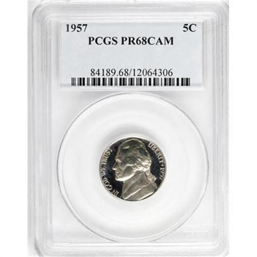 <B>1957 5C PR68 Cameo PCGS.</B></I> A nearly perfect Cameo proof that could only be improved by the addition of a little stronger contrast between the fields and devices. It is an impressive gold and gray example that is tied for the finest Cameo proof PCGS has certified. Population: 15 in 68 Cameo, 0 finer (12/07).<BR><BR><b>Shipping:</b> Coins & Currency (<a target="_blank" href="http://www.heritageauctions.com/common/shipping.php">view shipping information</a>)