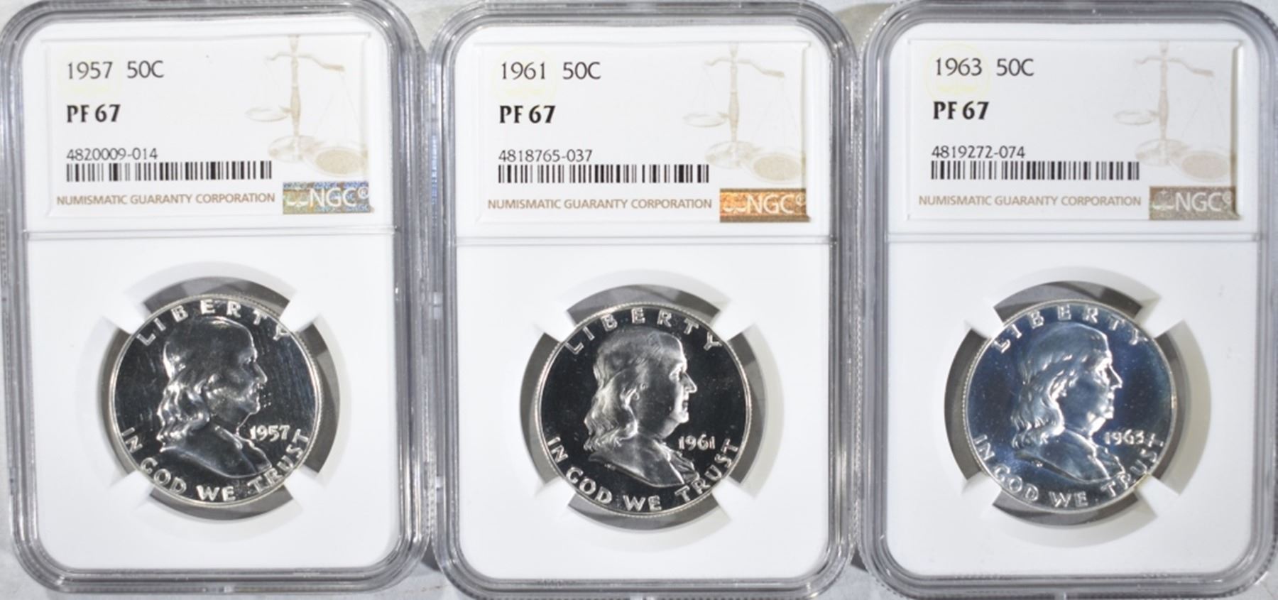 1957, 61 & 63 FRANKLIN HALF DOLLARS, NGC PF-67