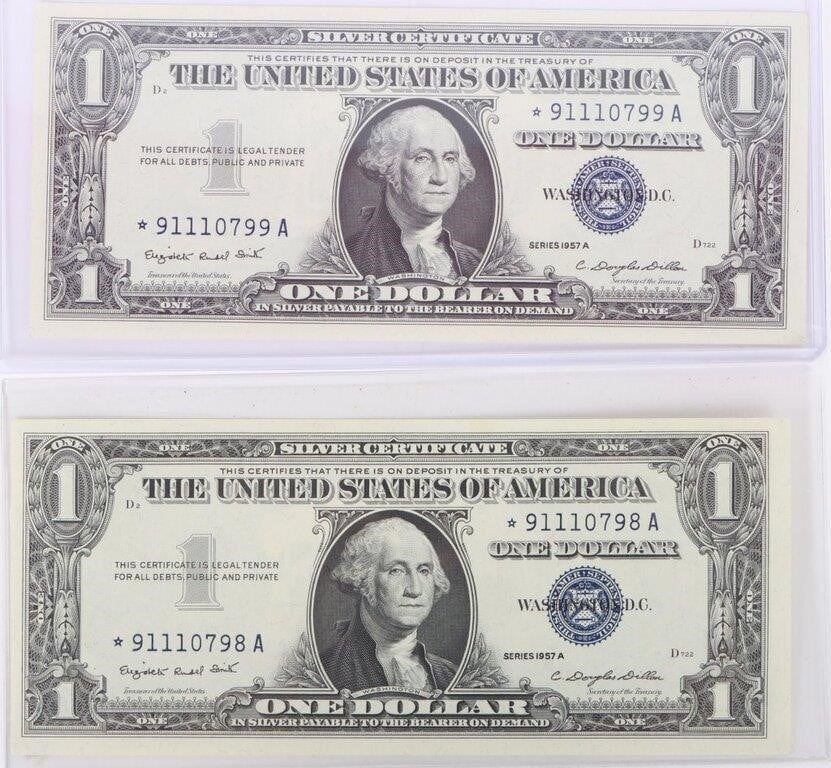 1957 A Uncirculated sequential $1 silver certificates star notes. Serial numbers include 91110799 A and 91110798 A.
