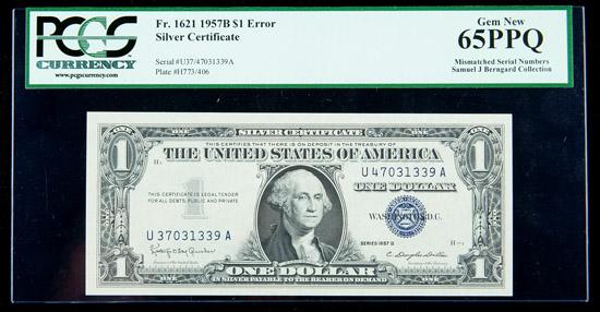 1957-B, $1 Silver Certificate. Mismatched Serial Numbers. PCGS Gem New 65PPQ. . Fr-1621. A pretty Gem example of this famous U37/47 mismatch.