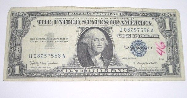 1957 B SERIES $1 BILL SERIAL # U08257558A *NICE BILL PLEASE LOOK AT PICTURE TO DETERMINE GRADE*!! ***Coin, Currency & All Items Listed in this auction - Grades, Conditions and Values are not Safe Deposit Coins LLC Responsibilty. Grades, Condition and Values are determined by Consigner(s) & Buyers ONLY***