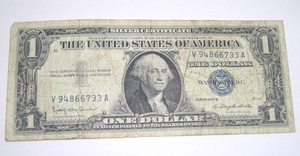 1957 B SERIES $1 BILL SERIAL # V94866733A *NICE BILL PLEASE LOOK AT PICTURE TO DETERMINE GRADE*!! ***Coin, Currency & All Items Listed in this auction - Grades, Conditions and Values are not Safe Deposit Coins LLC Responsibilty. Grades, Condition and Values are determined by Consigner(s) & Buyers ONLY***