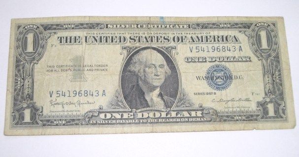 1957 B SERIES $1 SILVER CERTIFICATE BILL SERIAL # V54196843A *NICE BILL PLEASE LOOK AT PICTURE TO DETERMINE GRADE*!! ***Coin, Currency & All Items Listed in this auction - Grades, Conditions and Values are not Safe Deposit Coins LLC Responsibilty. Grades, Condition and Values are determined by Consigner(s) & Buyers ONLY