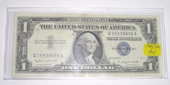 1957 B SERIES $1 SILVER CERTIFICATE BILL SERIAL # Q35939805A *EXTREMELY RARE AU HIGH GRADE*!! ***Coin, Currency & All Items Listed in this auction - Grades, Conditions and Values are not Safe Deposit Coins LLC Responsibilty. Grades, Condition and Values are determined by Consigner(s) & Buyers ONLY