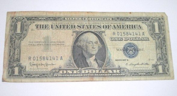 1957 B SERIES $1 SILVER CERTIFICATE BILL SERIAL # R01584141A *NICE BILL PLEASE LOOK AT PICTURE TO DETERMINE GRADE*!! ***Coin, Currency & All Items Listed in this auction - Grades, Conditions and Values are not Safe Deposit Coins LLC Responsibilty. Grades, Condition and Values are determined by Consigner(s) & Buyers ONLY