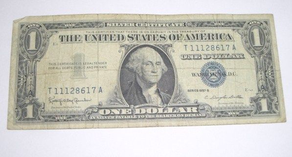 1957 B SERIES $1 SILVER CERTIFICATE BILL SERIAL # T11128617A *NICE BILL PLEASE LOOK AT PICTURE TO DETERMINE GRADE*!! ***Coin, Currency & All Items Listed in this auction - Grades, Conditions and Values are not Safe Deposit Coins LLC Responsibilty. Grades, Condition and Values are determined by Consigner(s) & Buyers ONLY