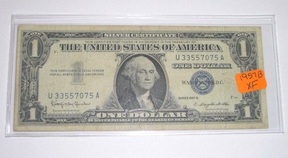 1957 B SERIES $1 SILVER CERTIFICATE BILL SERIAL # U33557075A *EXTREMELY RARE EXTRA FINE HIGH GRADE*!! ***Coin, Currency & All Items Listed in this auction - Grades, Conditions and Values are not Safe Deposit Coins LLC Responsibilty. Grades, Condition and Values are determined by Consigner(s) & Buyers ONLY