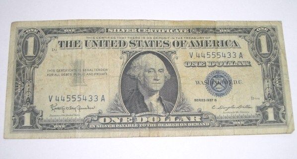 1957 B SERIES $1 SILVER CERTIFICATE BILL SERIAL # V44555433A *NICE BILL PLEASE LOOK AT PICTURE TO DETERMINE GRADE*!! ***Coin, Currency & All Items Listed in this auction - Grades, Conditions and Values are not Safe Deposit Coins LLC Responsibilty. Grades, Condition and Values are determined by Consigner(s) & Buyers ONLY