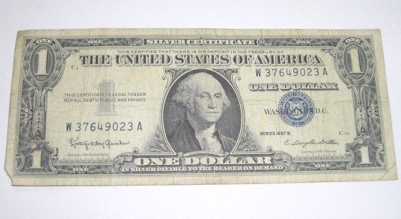 1957 B SERIES $1 SILVER CERTIFICATE BILL SERIAL # W37649023A *NICE BILL PLEASE LOOK AT PICTURE TO DETERMINE GRADE*!! ***Coin, Currency & All Items Listed in this auction - Grades, Conditions and Values are not Safe Deposit Coins LLC Responsibilty. Grades, Condition and Values are determined by Consigner(s) & Buyers ONLY