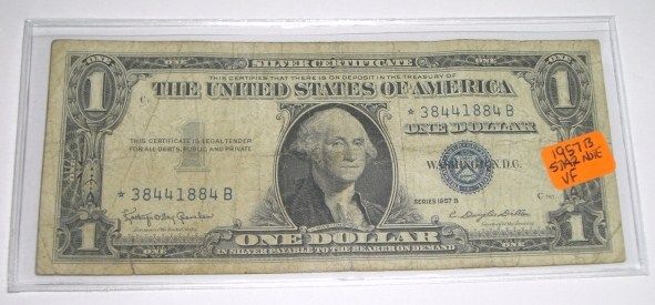 1957 B SERIES $1 SILVER CERTIFICATE *RARE STAR NOTE* SERIAL # *38441884B *EXTREMELY RARE VERY FINE HIGH GRADE*!! ***Coin, Currency & All Items Listed in this auction - Grades, Conditions and Values are not Safe Deposit Coins LLC Responsibilty. Grades, Condition and Values are determined by Consigner(s) & Buyers ONLY