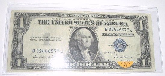 1957 B SERIES $1 SILVER CERTIFICATE SERIAL # B39446577J *RARE EXTRA FINE HIGH GRADE*!! ***Coin, Currency & All Items Listed in this auction - Grades, Conditions and Values are not Safe Deposit Coins LLC Responsibilty. Grades, Condition and Values are determined by Consigner(s) & Buyers ONLY